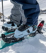 En mode marche, la partie supérieure est simplement débloquée et tournée vers l'avant, dévoilant ainsi la fixation à inserts. Pour réduire le poids des oscillations, la partie supérieure de la butée avant peut être enlevée et rangée dans un sac à dos. L’unité multifonction Lock & Walk bloque automatiquement le stop-ski et sert de cale de montée avec inclinaison à 10°.